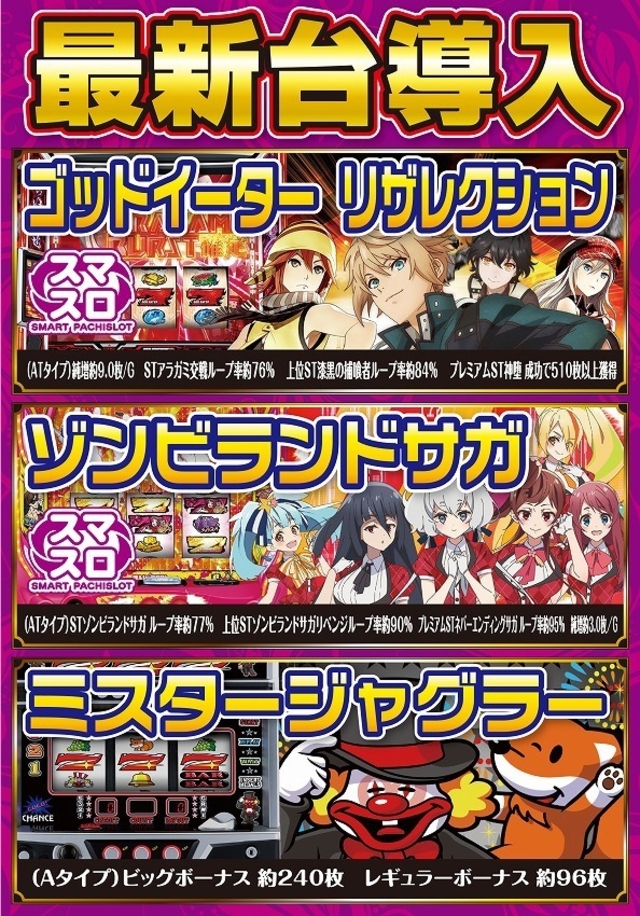 ニュース 1月新台入替 第2弾!! 2025年 1月 20日 1月新台入替 第2弾!! 最新機種が仲間入り♪ 皆様のご来店をお待ちしております! ニュース一覧 12月8日新台入替&店長ブログ更新! 11月4日新台入替!最新10機種が10時解禁♪ 10月20日最新台オープン!! 10月6日新台入替!! ファン感謝デー開催♪ 9月8日新台入替!! 8月18日新台入替&店長ブログ更新!! 8月6日新台入替!! 7月22日新台入替!! 令和7年7月7日 新台入替! 6月16日新台入替 6月4日新台入替!10機種21台が解禁♪ 5月23・24・25日の3日間 オリジナルファン感謝デー開催♪ 5月1日新台入替!! 4月21日新台入替! 4月7日新台入替!! ■3月17日新台入替■ 3月3日(月)新台入替!! 2月17日(月)新台入替! 2月5日新台入替! 1月新台入替 第2弾!! 1月6日新台入替 新春第一弾!! 謹賀新年!! 年末年始は休まず全力営業!! 12月度新台入替第2弾 12月4日新台入替!! 11月18日新台入替!! 11月5日(火)は新台入替!! 10月21日新台入替 スマスロリゼロ大量導入!! 10月7日新台入替!! 9月17日は新台オープンです! 9月最新台入替 第一弾 8月19日新台オープン!! 8月最新台入替 第1弾 新台オープン 7/8(月)新台入替!! 6月新台入替 第一弾 5月新台入替 第一弾 4月22日新台入替!! 4月8日は新台入替!! 大阪パチンコ・パチスロファン感謝デー開催!! 3月4日(月)新台入替! ◆2月新台入替◆ ◆1月22日新台入替◆ ◆1月9日 1月度新台入替第一弾◆ 年末年始は休まず営業致します! ◆12/18(月)新台入替告知◆ ◆12月新台入替◆ ■11月度新台入替■ ■11月度新台入替■ ■10/16(月)10月度新台入替第3弾■ ◆10月度新台入替 第1弾◆ ◆9月19日(火)新台入替◆ 「接客No.1に向け先陣を切れ!店長ブログ更新!」 ■9月度新台入替■ 「全店接客No.1を目指して!店長ブログ更新!」 「グループ全27店舗応援プロジェクト始動!」 ■8月度新台入替■ 「グループ全店で挑む夏!店長ブログ更新!」 「全店!2日連続店長ブログ更新!」 本日7月18日最新台解禁 「京一グループ全店!!スロット装飾変更!」 「グループ全店で【挑む!】店長ブログ更新!」 「7月7日【七夕】全店一斉店長ブログ更新!」 京一グループ全店!!スロット装飾変更! ■7月度新台入替■ 「グループ全26店舗革新!新たなる挑戦!」 本日6/23(金)は開店5周年記念日! 「全店!2日連続店長ブログ更新!」 6/19(月)最新台解禁です! 「京一グループ全店!!スロット装飾変更!」 グループ全26店舗一斉!店長ブログ更新! 6月5日(月)最新台10時解禁!スロット装飾変更! 「グループ全店接客強化月間!No.1を目指す!」 「グループ全26店舗一斉装飾変更!再:始動!」 「グループ全26店舗覚醒開始!一斉装飾変更!」 ■5月度新台入替■ ー譲れない戦いがココにあるー 「グループ全店一斉装飾変更!&新台入替!」 全店同時開催のあの感動をもう一度!―感動、再びー ■4月度最新台入替■ ■4月度新台入替第1弾■ ■4/3(月)スマスロL北斗の拳 OPEN♪■ グループ全店コラボ!ブログ・Twitter更新 ■ファン感謝デー開催■ 本日3月13日(月) グループ全店一斉ランキング開始!! ■3月度新台入替■ 3/6【SガンダムUC】グループ全店137台導入 ■2月度新台入替■ ■2月度新台入替■ ■1月度新台入替 第2弾■ ■1月度新台入替■ ■謹賀新年■ ■年末年始も休まず営業します‼■ ■12月度新台入替■ ■11/21~スマスロ全国最速OPEN‼■ ◆第32回全国パチンコ・パチスロファン感謝デー開催◆ ■11月度新台入替■ ■10月度新台入替■ ■9月新台入替第1弾■ ■8月度新台入替■ ■7月新台入替第1弾■ ■6月度新台入替 第1弾■ ■5月度新台入替■ ◆最新台OPEN♪・大幅レイアウト変更◆ ■ファン感謝デーのお知らせ■ ■3月度新台入替■ ■2月度新台入替■ ■2月新台入替第1弾■ 店内大幅リニューアルオープン!! ■1月度新台入替■ ■12月度新台入替■ ■12月度新台入替■ ■11月度新台入替■ ■10月度新台入替■ ■10月最新台オープン■ ■9月第一弾新台入替■ ■8月度新台入替■ ■7月度新台入替■ ■6月21日(月)新台入替■ ■6月度新台オープン第2弾■ ■5月度新台オープン第2弾■ ■5月10日(月)新台オープン■ ■4月5日(月)新台オープン■ ■第26回大遊協 ファン感謝祭開催■ ■3月度新台オープン準備完了♪■ ■2月度新台オープン第1弾■ ■1月度新台■ 新年あけましておめでとうございます♪ ■年末年始のご案内■ ■12月度新台入替■ ■12月度新台オープン第1弾■ ■第30回全国パチンコ・パチスロファン感謝デー■ ■11月度新台入替■ ■10月度新台入替■ ■新台入替■ ■3月度新台オープン■ ■2月度新台オープン第2弾■ ■新春1月度新台入替第2弾■ ■新春1月度新台オープン■ ■12月度新台オープン第2弾■ ■ZETTA茶屋町店「大切なお知らせ」■ ■11月度新台オープン第1弾■ ■10月度新台入替第1弾■ ■9月度新台入替第1弾■ ■8月度新台入替第1弾■ 【新台入替】7月9日(火) 全館10:00 OPEN 【新台入替】5月22日(水) 全館10:00 OPEN 【新台入替】5月8日(水) 全館10:00 OPEN 【新台入替】4月22日(月) 全館10:00 OPEN 【新台入替】3月18日(月) 全館10:00 OPEN 【夢まつり】3月15日(金)~17日(日) 【新台入替】2月27日(水) 全館10:00 OPEN 【新台入替】2月18日(月) 全館10:00 OPEN
