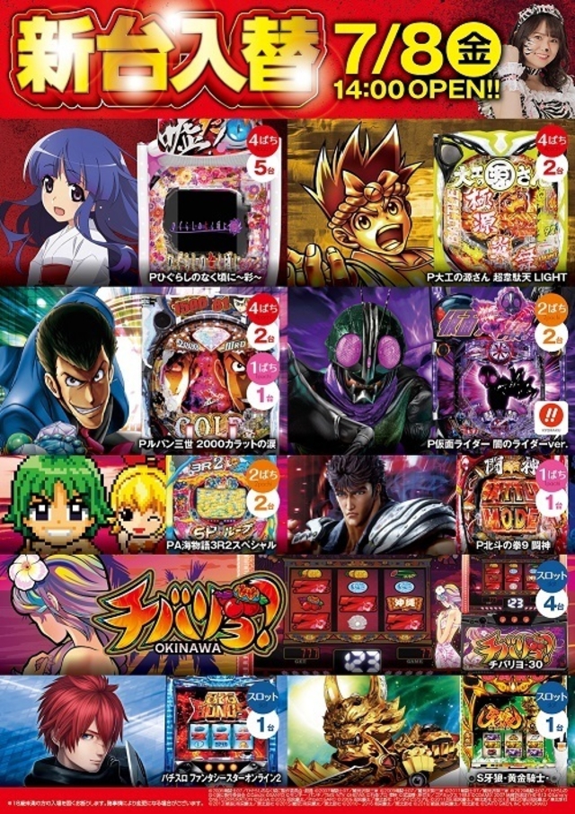 ニュース情報 2月21日(火)新台入替14時開店予定 2023年 2月 2月21日(火)新台入替14時開店予定!!植田店にいらっしゃいん♪ ニュース一覧 12/12(金)新台入替朝9時開店予定 11/26(水)新台入替14時開店予定!! 11/7(金)新台入替朝9時開店予定 10/21(火)新台入替14時開店予定 10/10(金)新台入替朝9時開店予定 9/25(木)新台入替朝9時開店予定 9/9(火)新台入替14時開店予定!! 8/22(金)新台入替朝9時開店予定 8/5(火)新台入替14時開店予定 7/23(水)新台入替朝9時開店予定 7/9(水)新台入替14時開店予定 6/20(金)新台入替14時開店予定 6/6(金)新台入替朝9時開店予定!!6月は創業月間!! 5/20(火)新台入替14時開店予定 5/9(金)新台入替朝9時開店予定!! 4/26(土)リニューアルオープン10時開店予定 4/11(金)新台入替14時開店予定 3/25(火)新台入替朝9時開店 3/5(水)新台入替14時開店予定 3/3(月)朝9時開店予定 2/18(火)新台入替14時開店予定 2/7(金)新台入替朝9時開店予定 1/21(火)新台入替朝9時開店予定 1/7(火)新台入替14時開店予定 12/24(火)朝9時開店予定 12/20(金)新台入替朝9時開店予定 12/3(火)新台入替14時開店予定 11/22(金)新台入替朝9時開店予定 11/6(水)新台入替14時開店予定 10/22(火)新台入替14時開店予定 10/11(金)新台入替朝9時開店予定 9/24(火)新台入替14時開店予定 9/6(金)新台入替朝9時開店予定!! 8/20(火)新台入替14時開店予定 8/6(火)リニューアルオープン朝9時開店予定 8/2(金)朝9時開店予定!! 8/1(木)朝9時開店予定 7月26日(金)新台入替14時開店予定 7月12日新台入替朝9時開店予定 6/28(金)新台入替朝9時開店予定 6月4日(火)新台入替14時開店予定 5月22日(水)新台入替朝9時開店予定 5月7日(火)新台入替14時開店予定 4月26日(金)リニューアルオープン14時開店予定 4月12日(金)新台入替14時開店予定 3月22日(金)新台入替朝9時開店予定 3月8日(金)新台入替14時開店予定 2月9日(金)新台入替朝9時開店予定 1月26日(金)新台入替朝9時開店予定 1月12日(金)新台入替14時開店予定 12月22日(金)新台入替朝9時開店予定 12/8(金)新台入替14時開店予定 11月24日(金)新台入替14時開店予定 11月10日(金)新台入替朝9時開店予定 10月20日(金)新台入替14時開店予定 10/6(金)新台入替朝9時開店予定 9月22日(金)新台入替14時開店予定 9/8新台入替朝9時開店予定 8/25新台入替朝9時開店予定 8/1(火)朝9時開店予定 7/31(月)新台入替14時開店予定 7/7(金)新台入替朝9時開店 6/23新台入替 6/9新台入替 5/26新台入替 5/19新台入替 5月12日(金)新台入替 4/28新台入替朝9時開店予定 4/21(金)新台入替14時開店予定 4/7(金)新台入替14時開店予定 3月24日(金)新台入替14時開店予定 3月10日(金)新台入替朝9時開店予定 2月21日(火)新台入替14時開店予定 2/10新台入替朝9時開店予定 1/27(金)新台入替朝9時開店予定 1/10(火)新台入替14時開店予定 12月23日(金)新台入替14時開店 12/6新台入替朝9時開店 11月25日(金)新台入替朝9時開店予定 11/11(金)新台入替14時開店 10/25(火)新台入替朝9時開店 10/7新台入替14時開店 9/22(木)新台入替朝9時開店 9/9(金)新台入替14時開店 8/26(金)新台入替14時開店 8/5(金)新台入替朝9時開店 7/22(金)新台入替朝9時開店 7月8日(金)新台入替14時開店 6/24(金)新台入替14時開店 6月10日(金)新台入替朝9時開店 5/27(金)新台入替14時開店 5/13新台入替朝9時開店 4月22日(金)新台入替14時開店 4月8日(金)新台入替朝9時開店 3月25日(金)新台入替14時開店 3月11日(金)新台入替朝9時開店 2/25(金)新台入替14時開店 2月11日(金)新台入替朝9時開店 1月28日(金)新台入替朝9時開店 1月14日(金)新台入替14時開店 12月24日(金)新台入替14時開店 12/10(金)新台入替朝9時開店 11月26日(金)新台入替14時開店 11月12日(金)新台入替朝9時開店 10月22日(金)新台入替朝9時開店 10月9日(土)朝9時開店 10/8(金)14時開店 新台入替14時開店!! 新台入替朝9時開店!! 新台入替14時開店!! 新台入替9時開店!! 8/1(日)朝9時開店お客様に感謝を込めて 新台入替9時開店店内設備大幅変更!! 新台入替14時開店!! 新台入替9時開店!!2円ぱちんこ始めました!!
